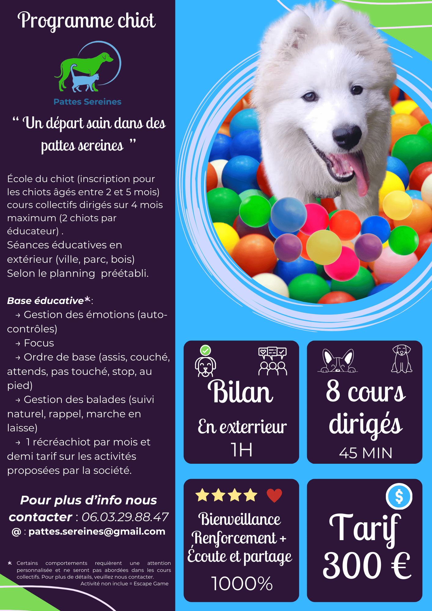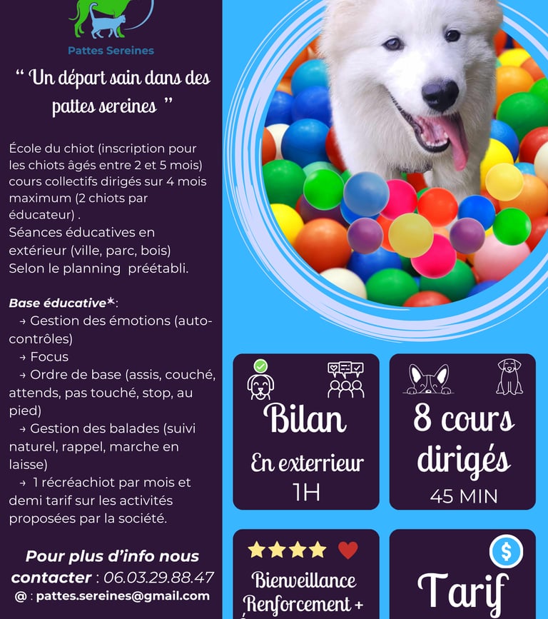 *Certains comportements requièrent une attention personnalisée et ne seront pas abordées dans les cours collectifs. Pour plus de détails, veuillez nous contacter.